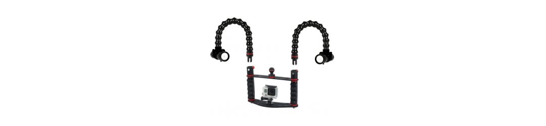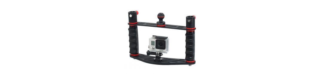 Unterwasser Tray schiene für Actioncameras mit Ergonomischer Handgriff , Ultraleicht, mit Umspritzte Gewindeeinsätze und Anti-Ausschraubsystem.