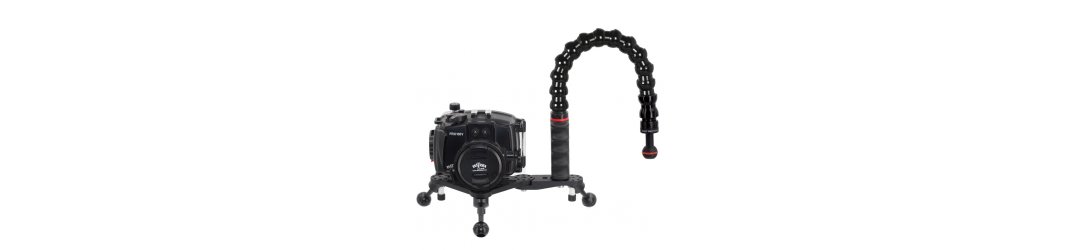 Die beiden abnehmbaren Verlängerungen können von -90 bis +45 Grad gedreht werden, wodurch die Handgriffe in Bezug auf die Mitte der Kamera zurückgezogen oder vorgeschoben werden. Dies sind ideale Positionen für Unterwasser-Videoaufnahmen