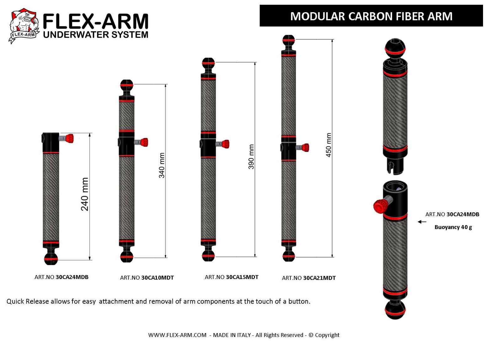 Modular Carbon Float Arm 30 mm with Quick Release Base and 1-Inch Ball Leng 240 mm