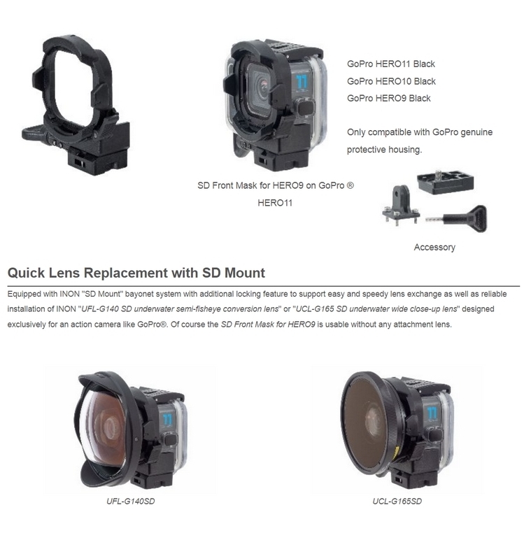 Equipped with INON SD Mount bayonet system with an additional locking feature to support easy and speedy exchange as well as reliable installation of INON UFL-G140 SD underwater semi-fisheye conversion lens or UCL-G165 SD underwater wide close-up lens designed exclusively for an action camera like GoPro. Of course, the SD Front Mask for HERO9 is usable without any attachment lens.