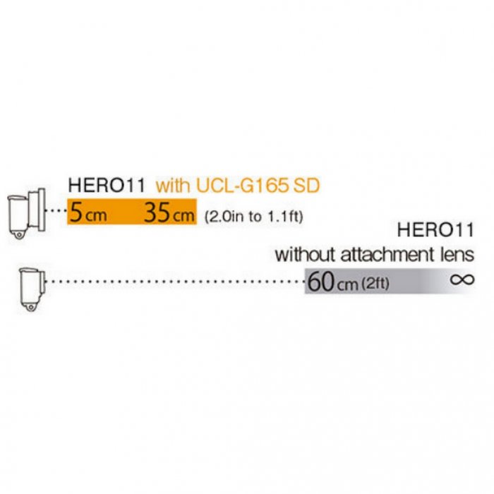 An action camera is a deep focus camera which does not require focusing but prevents a subject gets in focus in close range (within 60cm/2ft range in theory for GoPro® camera) thus not usable for underwater macro shooting. Using standard macro lens for a compact digital camera would not help the situation as it would create vignetting and very shallow depth of field preventing comfortable focusing. The UCL-G165 SD lens is so-called "wide close-up lens" specifically designed for action cameras based on their optical characteristic. The depth of field (DoF) underwater will be 5cm/2.0in to 35cm/1.1ft when using the lens for GoPro® HERO7 Black supporting closer minimum focus distance underwater to capture wow photos/clips.