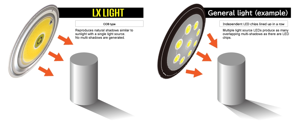 Shadows unique to LED lighting are different from sunlight when an object is illuminated by LED lighting that consists of multiple LED light-emitting chips. When an object is illuminated by LED lighting composed of numerous LED light-emitting chips, unnatural shadows (multiple shadows) are produced, different from those produced by sunlight. Multiple shadows can obscure the outline of an object and reduce its visibility. Single light source COB, a single light source, does not produce multiple shadows.