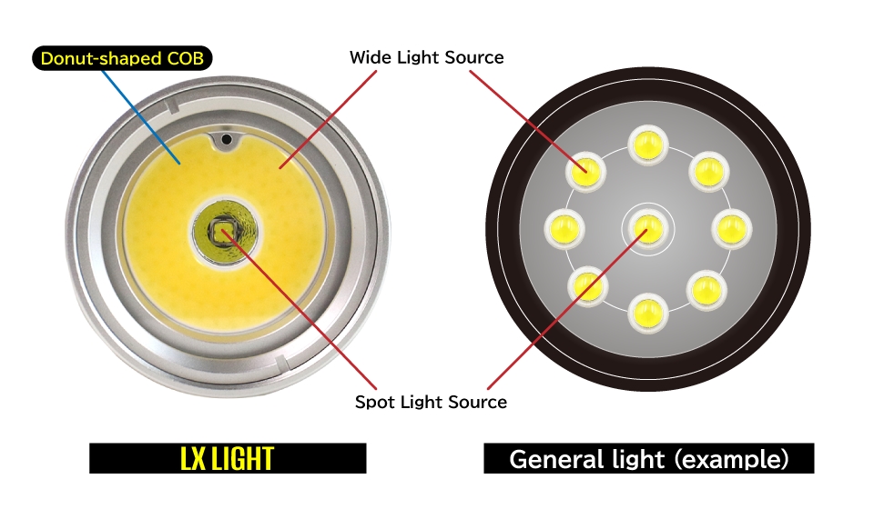 COB" is a type of LED. COB" is an abbreviation for "Chip on board," as the name suggests, multiple LED chips are placed directly on the board. Since multiple LED chips are arranged in a concentrated manner, high luminance is achieved. In addition, since the light is emitted from a surface, a large surface can be illuminated evenly. SEA&SEA is the first in Japan to lay out "COB" in a doughnut shape. Even with wide light, shadows are less likely to form in the center, resulting in uniform light.