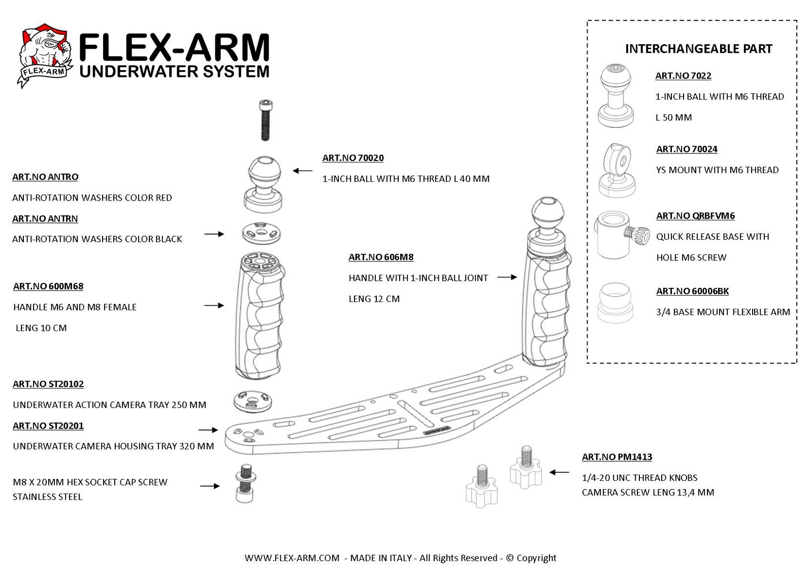 Underwater tray for action camera with ergonomic handles ultralight, with overmolded threaded inserts and anti-unscrewing system.