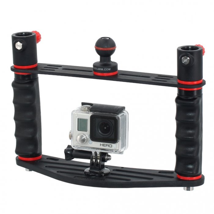 Underwater tray for action camera with ergonomic handles ultralight, with overmolded threaded inserts and anti-unscrewing system.