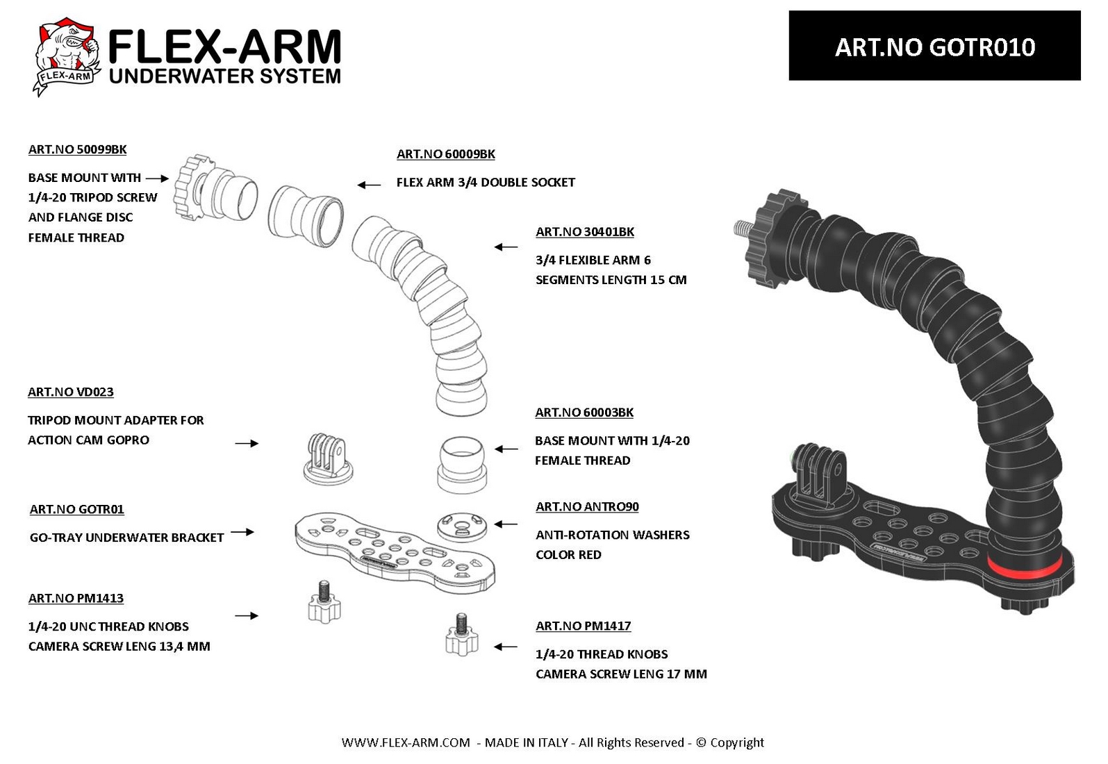 GO-TRAY Underwater Bracket With 3/4 Flex Arm and 1/4 Tripod Screw