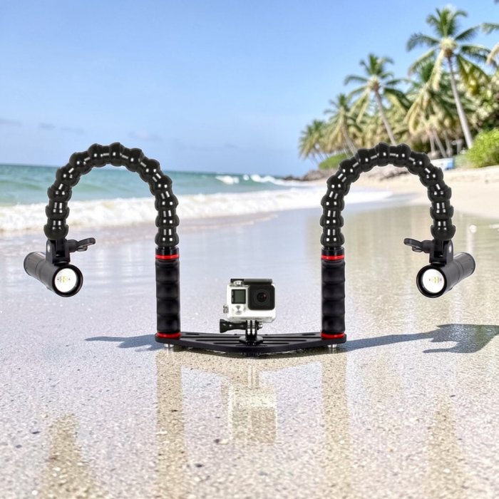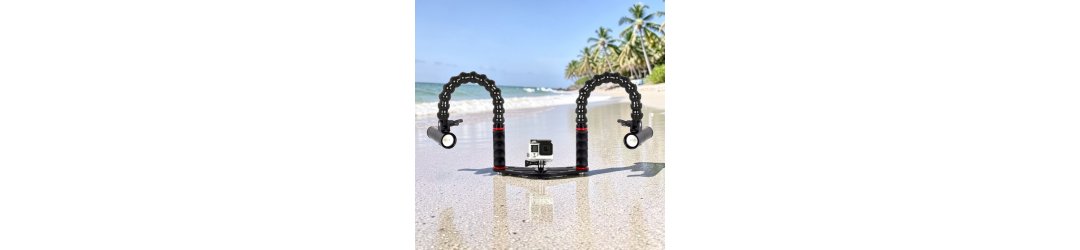 Underwater tray for action camera with handles flex arms universal lights adapter and two underwater video light  Supe PV22 2000 lumen rechargeable
