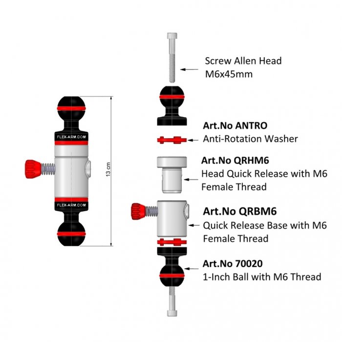 Brazo Doble Bola 25 mm con Zafado Rápido Largo 130 mm