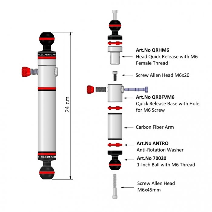 Brazo en Fibra de Carbono Doble Bola 25 mm con Zafado Rápido Largo 24 cm