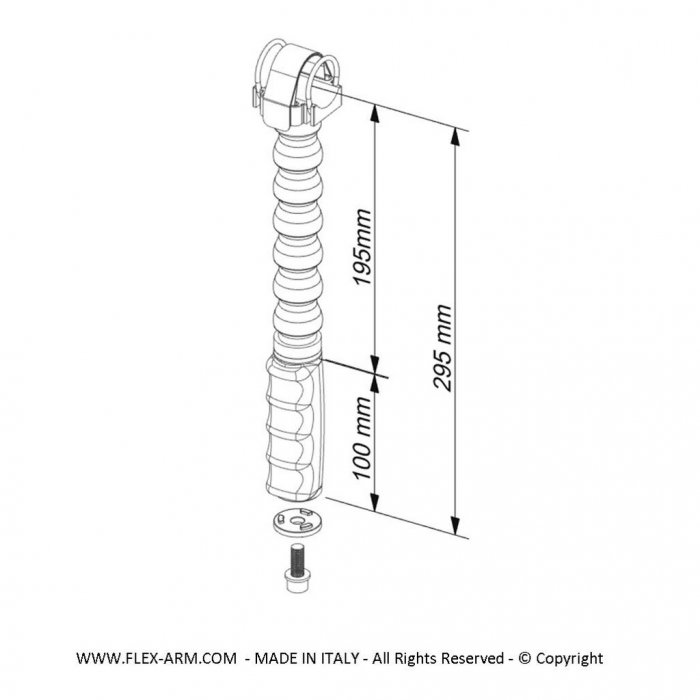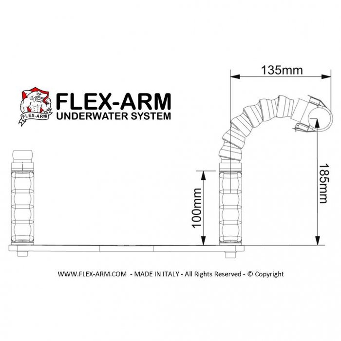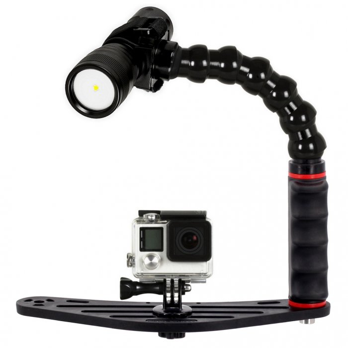 Puño ergonómico para pletina submarinos, ultraligero, insertos roscados sobremoldeados y sistema anti-desenroscado. Brazo flexible con 6 segmentos con adaptador universal para focos, le permite montar focos cilíndricos com diámetros de entre 2 y 5 cm.