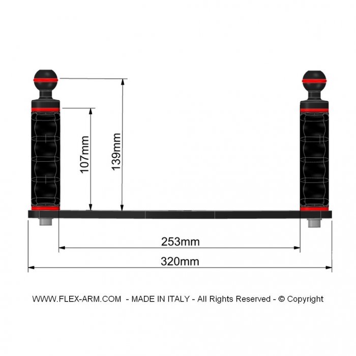 Pletina para Carcasas Submarinas con Doble Puño Bola 25 mm y Brazo 18 cm con Bola para Flash AOI Ultra Compact Strobe Q1i
