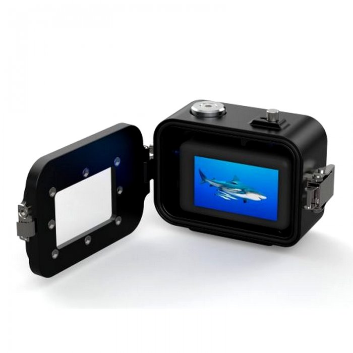 Fixation via deux filetages caméra 1/4″ sur la base du boîtier. Si vous avez besoin d'une option de montage compatible GoPro, il existe un adaptateur approprié, qui doit être commandé séparément.