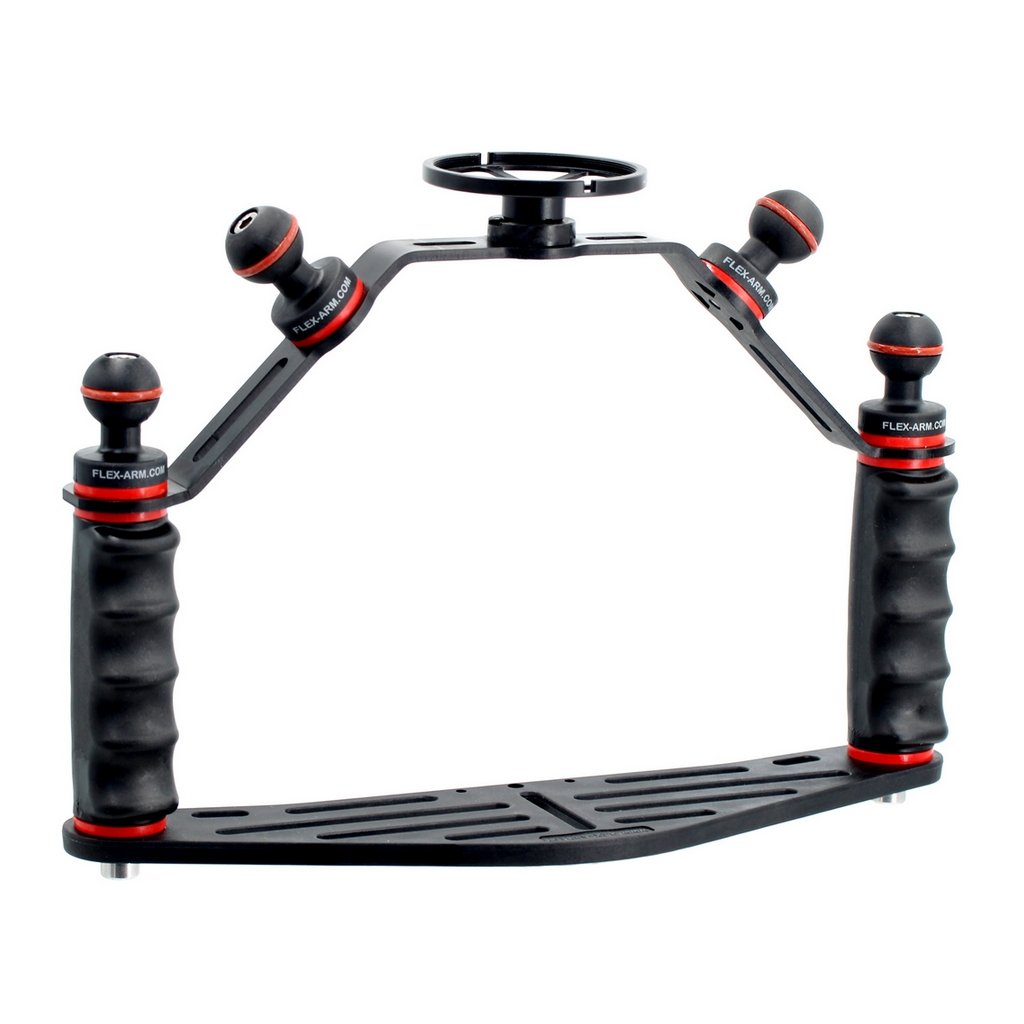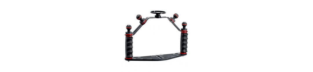 Platine Universelle pour Caisson Photo Sous-Marine avec poignées ergonomique, ultralégère, avec inserts filetés surmoulés et système anti-dévissage.