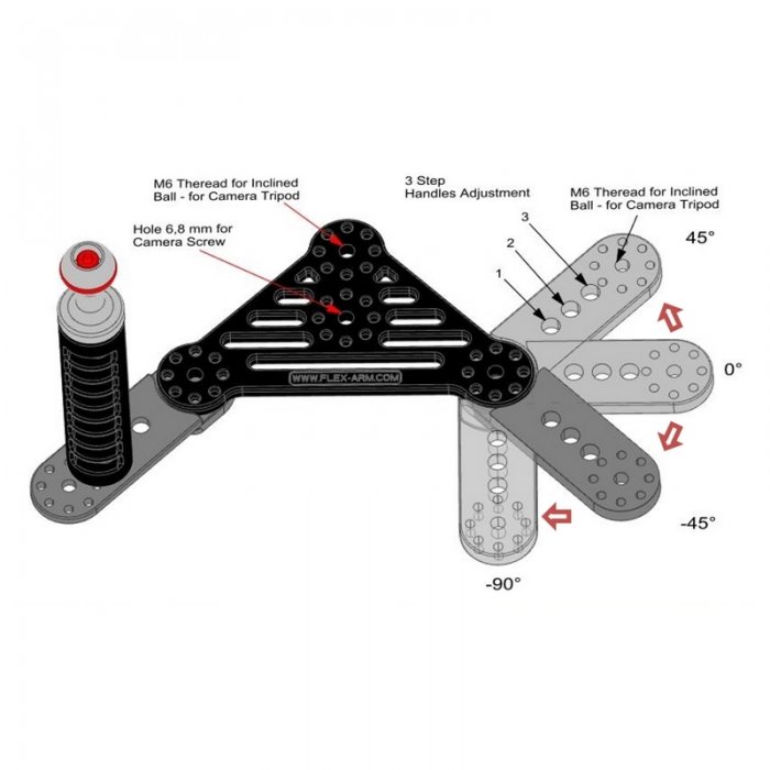 Les deux extensions amovibles peuvent être tournées de -90 à +45 degrés, retirant ou avançant ainsi les poignées par rapport au centre de la caméra, positions idéales pour les caméras vidéo sous-marines