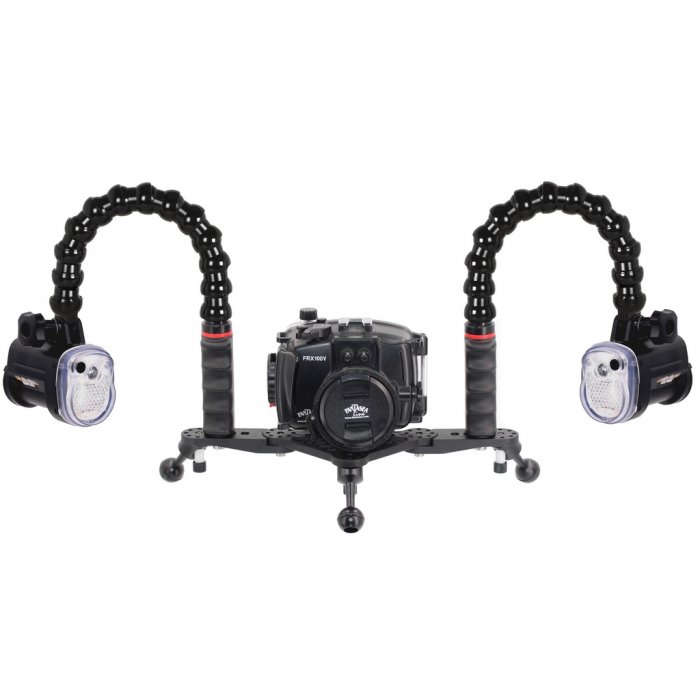 Les deux extensions amovibles peuvent être tournées de -90 à +45 degrés, retirant ou avançant ainsi les poignées par rapport au centre de la caméra, positions idéales pour les caméras vidéo sous-marines