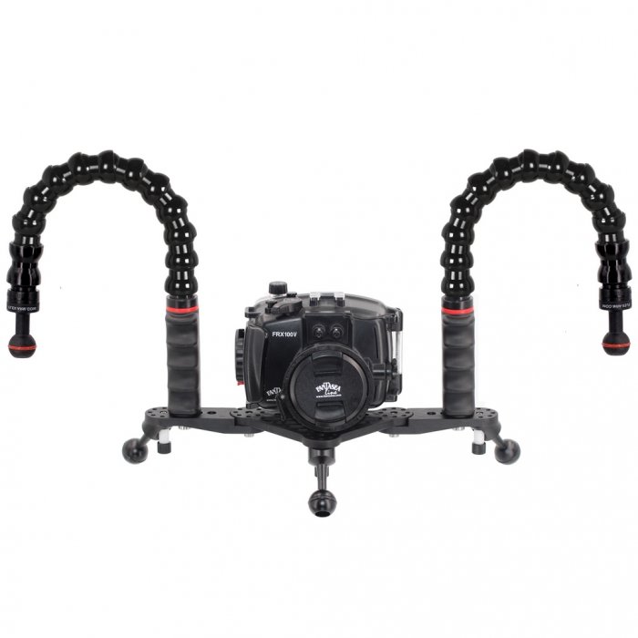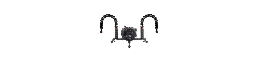 Les deux extensions amovibles peuvent être tournées de -90 à +45 degrés, retirant ou avançant ainsi les poignées par rapport au centre de la caméra, positions idéales pour les caméras vidéo sous-marines