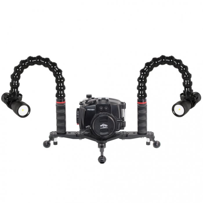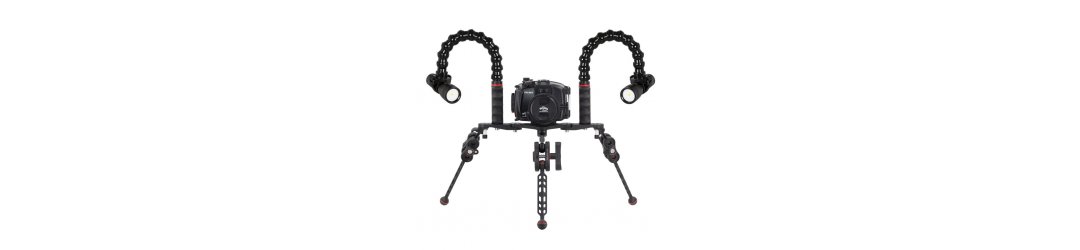 Les deux extensions amovibles peuvent être tournées de -90 à +45 degrés, retirant ou avançant ainsi les poignées par rapport au centre de la caméra, positions idéales pour les caméras vidéo sous-marines