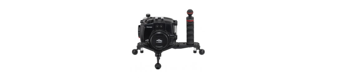 Le due estensioni rimovibili, possono essere ruotate da -90 a +45 gradi, arretrando o avanzando così le  impugnature rispetto al centro della fotocamera, posizioni ideali per le videoriprese subacquee
