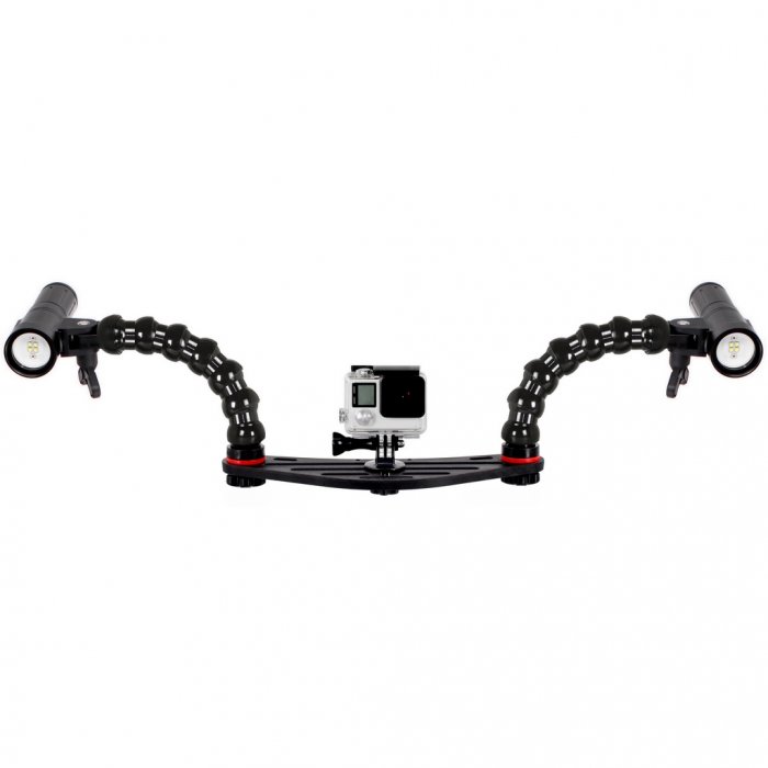 Staffa singola in tecnopolimero per il supporto di action cam e fotocamere subacquee, composta da N.2 braccetti flessibili Lung. 20 cm con terminale Ys (compatibile Sea&Sea, Inon, Epoque)